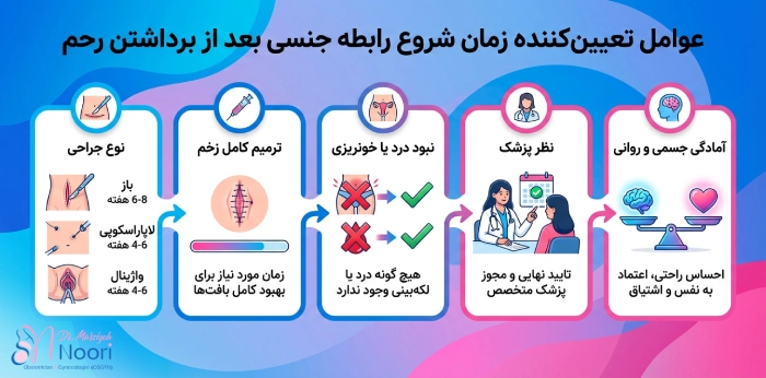 در تعیین زمان مناسب برای شروع رابطه جنسی بعد از عمل برداشتن رحم، چند عامل پزشکی و فردی دخیل هستند که هرکدام میتوانند روند بهبودی را تغییر دهند. مهمترین این عوامل عبارتاند از: